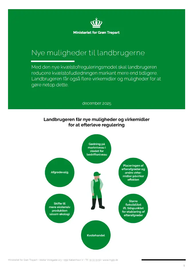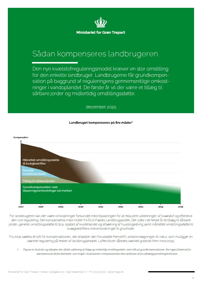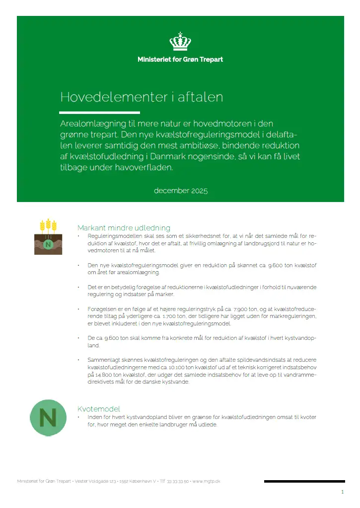 Regeringen (S, V, M) har sammen med partierne bag Aftale om Implementering af et Grønt Danmark (SF, LA, K og RV) indgået en aftale om fordelingen af landbrugets kvælstofudledninger, og hvordan landbrugerne skal kompenseres for at reducere deres udledninger.