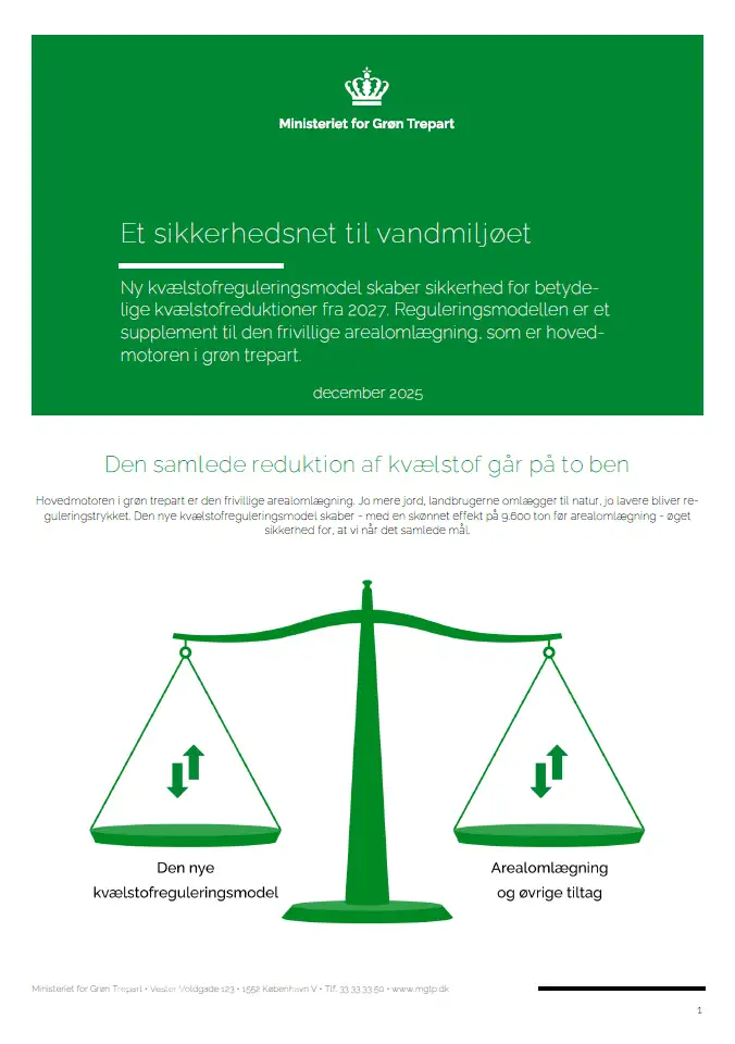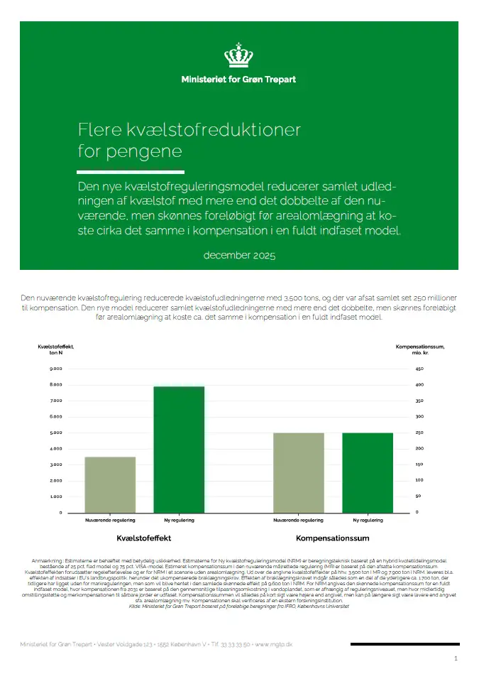 Aftalen skaber en mere effektiv begrænsning af kvælstofudledninger, samtidig med at den giver den enkelte landbruger fleksibilitet og kompensation for omkostningerne. Den nye reguleringsmodel indebærer et højere reguleringstryk på ca. 7.900 ton kvælstof. Herudover hentes yderligere ca. 1.700 ton fra kvælstofreducerende tiltag på markerne, der tidligere har ligget uden for markreguleringen. Samlet set skønnes reguleringen således at bidrage med ca. 9.600 ton kvælstofreduktioner fra landbruget i et scenarie uden arealomlægning. Dertil kommer yderligere ca. 500 ton kvælstofreduktion fra spildevandsrensning. Sammenlagt skønnes kvælstofreguleringen og den aftalte spildevandsindsats at reducere med ca. 10.100 ton kvælstof, hvilket er mere end to tredjedele af det samlede indsatsbehov for at leve op til vandrammedirektivets mål for de danske kystvande. Det er et helt afgørende skridt for at genskabe livet i havet.