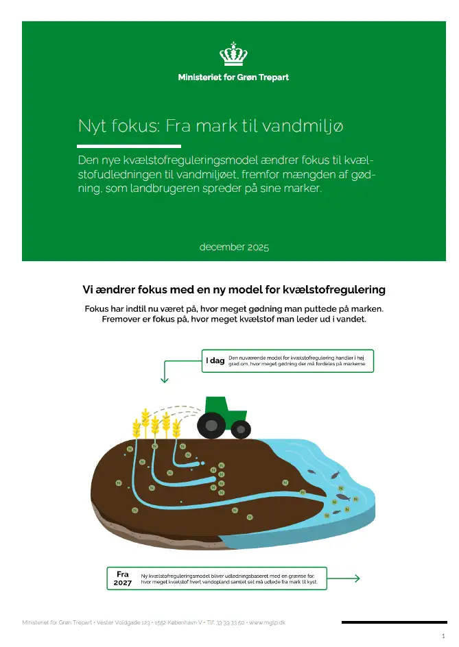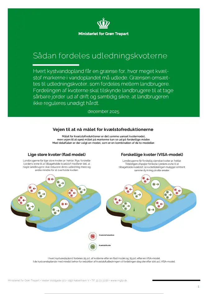 Aftalen introducerer en helt ny måde at regulere markernes udledning af kvælstof til vandmiljøet. Vi går fra at have fokus på, hvad der sker på markerne, til udledningerne af kvælstof til vandet, og hvad vandmiljøet kan holde til. Derfor vil landbrugerne fra 2027 få en kvote for deres udledninger ud fra, hvor meget deres vandopland skal begrænse udledningerne af kvælstof til vandet. Kvælstofkvoterne justeres i takt med, at der kommer nye målinger af, hvor meget kvælstofudledning vandmiljøet kan klare, og i takt med at landmændene omlægger til natur. Den midlertidigt forhøjede kvælstofregulering udfases i takt med, at landmændene udtager jord og dermed begrænser deres udledning.