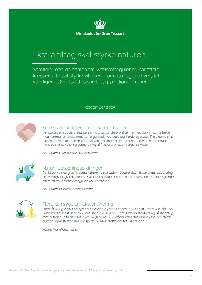 Aftalen styrker også naturen og økologien. Med aftalen sættes der et mål om at skabe 10 signaturprojekter med større sammenhængende naturområder frem mod 2035 i samarbejde med kommuner, lokale treparter, organisationer, lodsejere og fonde. Og reguleringen kan stille landbrugere, der omstiller til økologi, bedre.